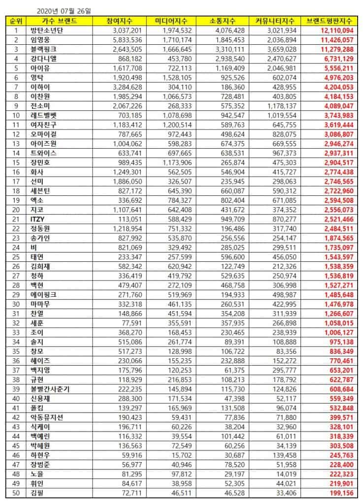 Sıralamalar, 25 Haziran – 25 Temmuz tarihleri arasında toplanan büyük veriler kullanılarak, şarkıcıların; medya kapsamı, tüketici katılımı, etkileşim ve toplum farkındalığı endekslerinin analizi ile belirlendi.