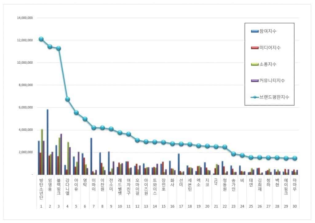 BTS, temmuz ayında listenin zirvesinde yer alarak toplam 12.110.094 marka itibar endeksine ulaştı.