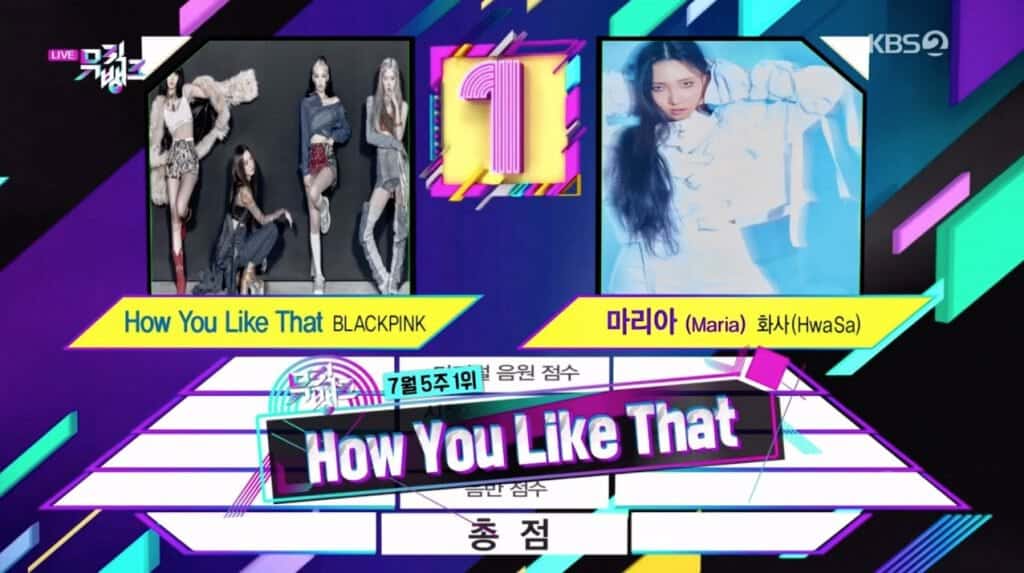 KBS’in “Music Bank” müzik programının 31 Temmuz’daki bölümünde; BLACKPINK’in “How You Like That” ve Hwasa’nın “Maria” şarkıları birincilik için aday gösterildi. Hwasa 4,262 puan alırken, BLACKPINK 6,082 puanla kazanan isim oldu.