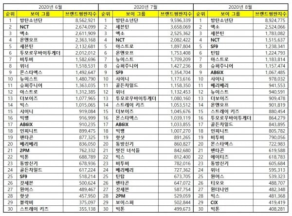 BTS, Ağustos ayı için 8.924.775 marka itibar endeksi ile üst üste 27 aydır listenin zirvesinde yer aldı. Grubun anahtar kelime analizinde üst sıralardaki ifadeler arasında “Billboard“, “Dynamite” ve “Oricon” yer alırken; en yüksek sıralamaya sahip ilgili terimler ise “aşmak“, “lansman” ve “bağış yapmak” oldu. BTS’in pozitiflik-negatiflik analizi %83,55 ile pozitif tepki aldı.