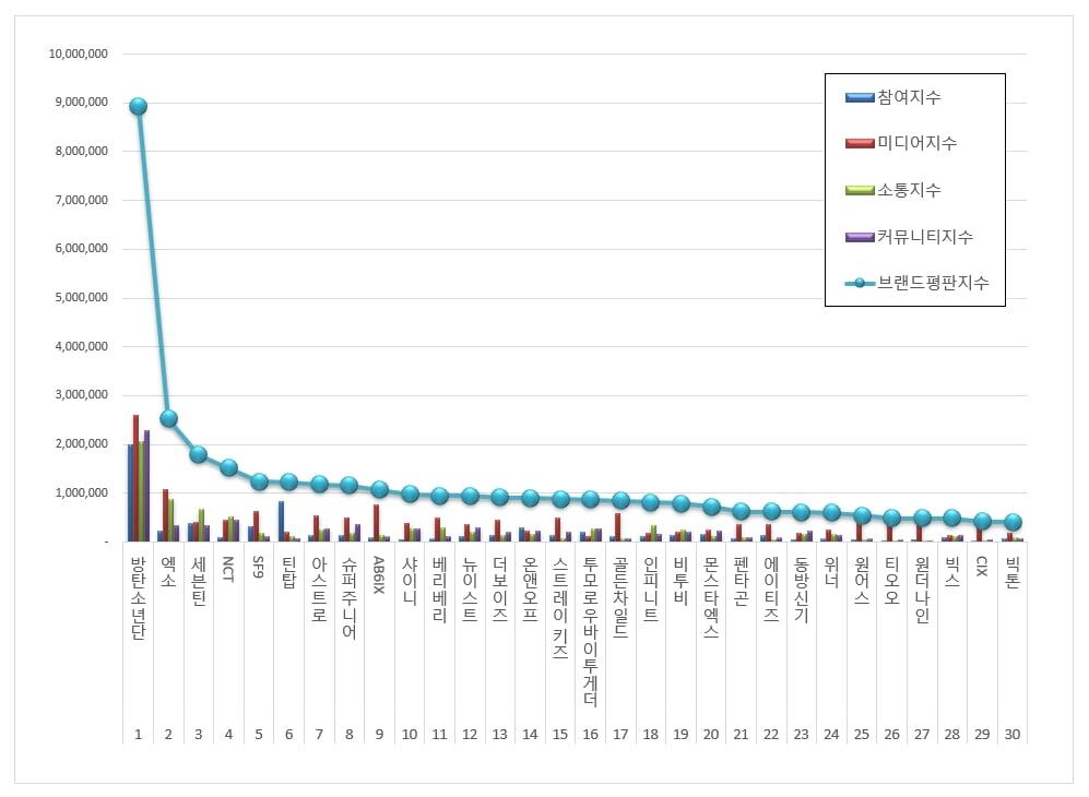 EXO, 2.523.066 marka itibar endeksiyle bu ayın sıralamasında ikinci olurken; SEVENTEEN toplam 1.783.082 endeksle üçüncü oldu.