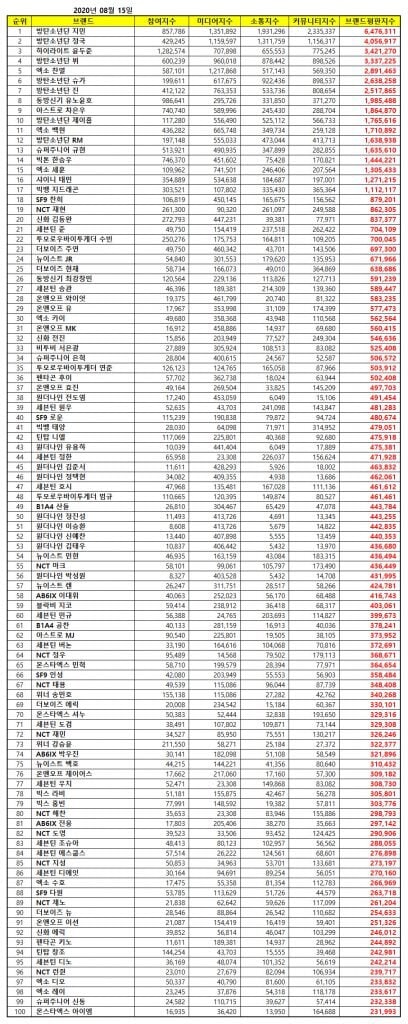 Sıralamalar, 14 Temmuz – 14 Ağustos tarihleri arasında toplanan büyük veriler kullanılarak, 645 erkek grubu üyesinin; tüketici katılımı, medya kapsamı, iletişim ve toplum farkındalığı endekslerinin analizi ile belirlendi.