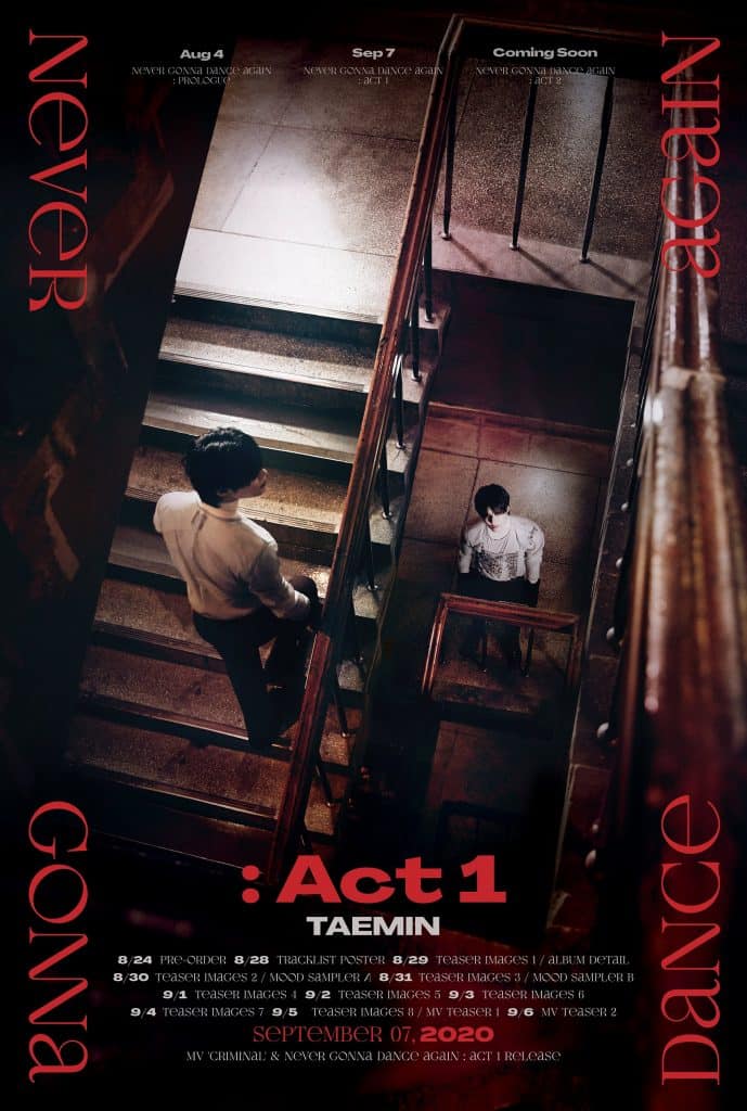 24 Ağustos gece yarısı (KSİ) Taemin, geri dönüşünün ikinci bölümü “Never Gonna Dance Again: Act 1” için bir tanıtım programı yayımladı. 7 Eylül’de, albümün başlık parçası “Criminal”ın müzik videosu yayımlanacak.