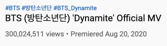 Ve 5 Eylül’de “Dynamite“, 15 gün 3 saat ve 50 dakikanın ardından 300 milyon izlenmeye ulaşarak, YouTube tarihinde bunu en hızlı başaran grup, erkek sanatçı, Koreli sanatçı ve Asyalı sanatçı oldu. Genele baktığımızda ise Taylor Swift’in (13 gün) ardından bunu en hızlı başaran 2. müzik videosu oldu.
