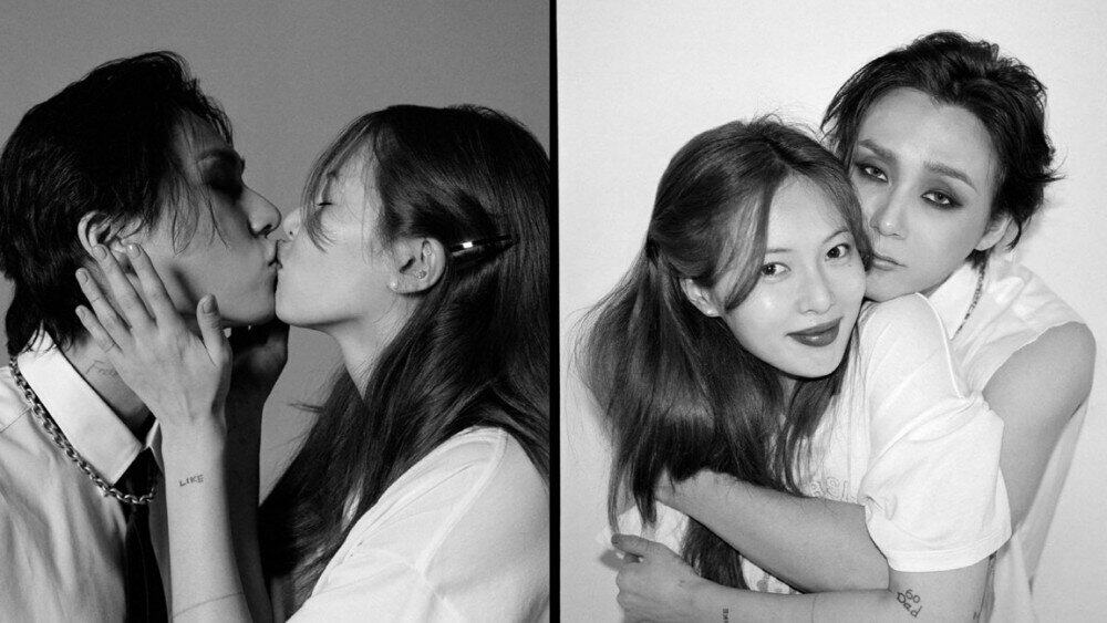 HyunA mutlu bir şekilde gülümserken, iki şarkıcı beyaz bir arka planın önünde poz verdi.