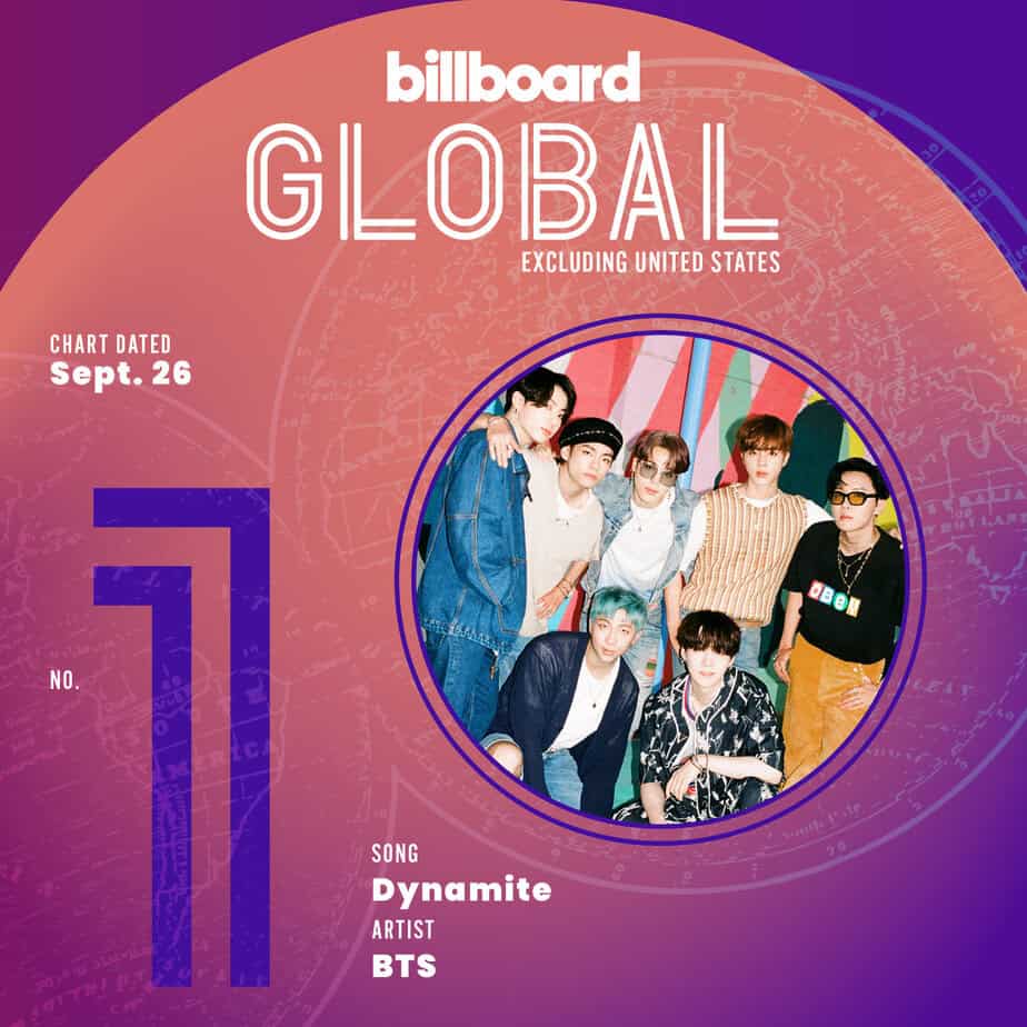 .@BTS_twt‘s “Dynamite” is officially No. 1 on this week’s Global 200 Excl. U.S. chart.