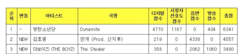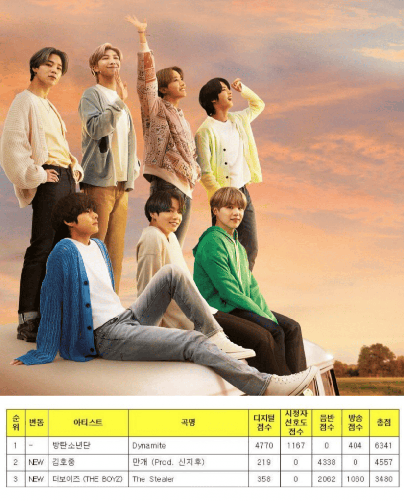 BTS’ten “Dynamite”, Kim Ho Joong’un “In Full Bloom” şarkısına karşı birinci oldu. 6.341 puanla BTS’ten “Dynamite” birinci, Kim Ho Joong’un “In Full Bloom” ise 4,557 puanla ikinci oldu. Ayrıca The Boyz’un “The Stealer” şarkısının 3.480 puanla üçüncü olduğu açıklandı.