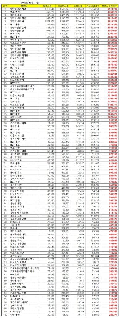 Sıralamalar, 16 Eylül – 16 Ekim tarihleri arasında toplanan büyük veriler kullanılarak, 653 erkek grubu üyesinin; tüketici katılımı, medya kapsamı, iletişim ve toplum farkındalığı indekslerinin analizi ile belirlendi.