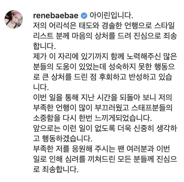 Red Velvet’ten Irene son zamanlarda bir editör ve stilistin genç yıldızın kaba oluşunu eleştirmek için olayı Instagram’a götürdüğü bir tutum tartışmasına sürüklendi. Daha sonra, hem SM Entertainment hem de Irene, olay için özür dileyen ifadeler yayınladı.