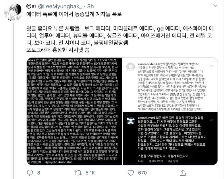 Birçok dergi editörü bu iddiayı desteklemekle kalmadı, aynı zamanda Red Velvet ve SHINee’nin önceki stilistlerin yanı sıra BoA’nın mevcut stilistinin de aynı şekilde gönderiyi beğendiği bildirildi. İlk çıkışından bu yana BLACKPINK’ten sorumlu olan tırnak teknisyeni Park Eun Kyung (Nail Unistella olarak da bilinir) görünüşe göre bu yazıyı da beğendi.