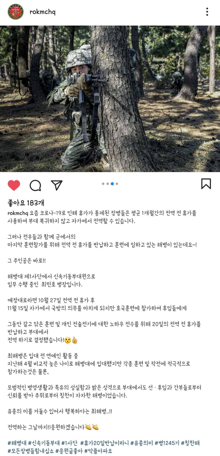 Minho, yeni katılan askerlere bilgi ve deneyimlerini aktarmak için erken terhis hakkını reddetti. Bununla ilgili Deniz Kuvvetleri, Instagram hesabında paylaşım yaptı. Paylaşımda Minho’nun; örnek çalışmaları, ciddiyeti ile herkesten övgü alan bir denizci olduğundan bahsediliyor.