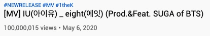 IU, BTS‘ten SUGA‘nın yapımcılığını üstlendiği ve rapiyle de yer aldığı “eight“i , 6 Mayıs 2020 saat 18:00’de (KST) yayımladı. 6 aydan kısa bir sürede, 6 Kasım 04:55’te (KST) müzik videosu 100 milyon görüntülenmeye ulaştı.