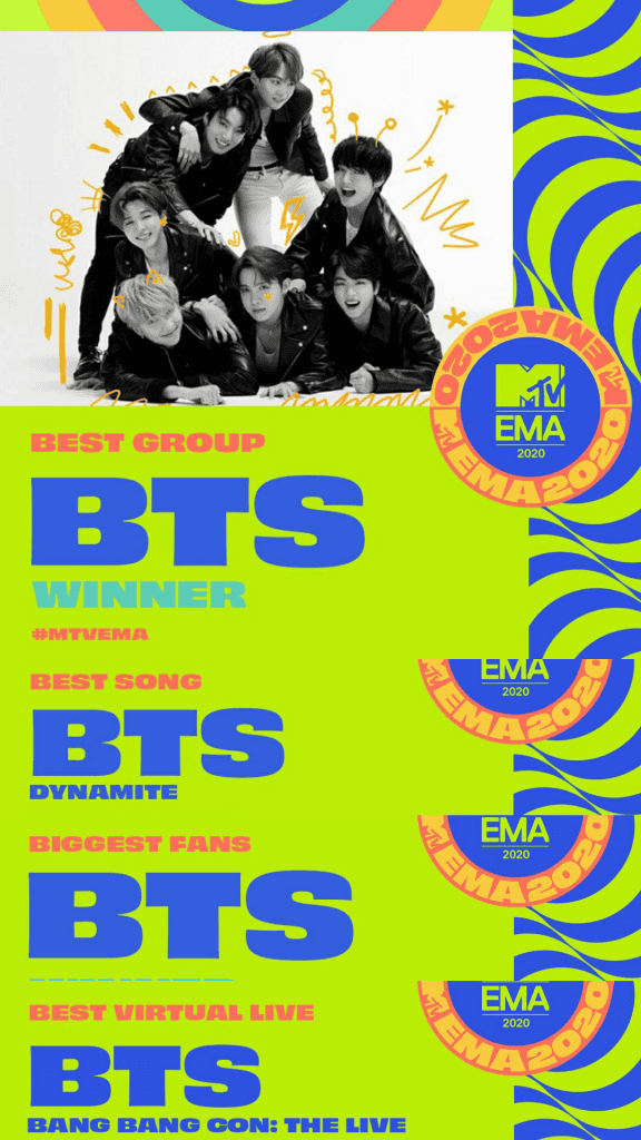8 Kasım’da düzenlenen 2020 MTV Avrupa Müzik Ödülleri‘nde aday gösterildiği 5 kategoriden 4’ünü kazanan BTS, gecenin en büyük galibi olmayı başardı.