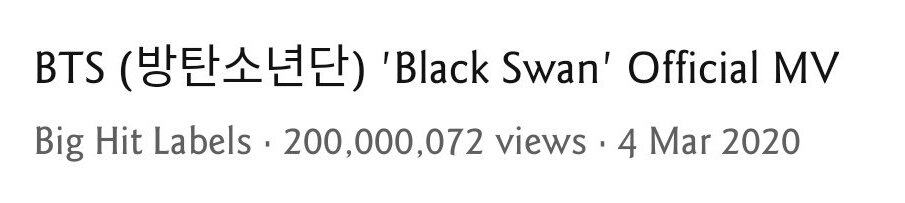 19 Kasım’da, BTS‘in “Black Swan” müzik videosu YouTube’da 200 milyon görüntülenme sayısını aştı.