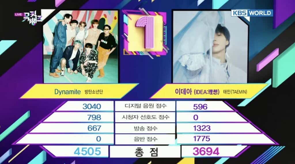 Music Bank‘in 20 Kasım’daki bölümünde, BTS’in “Dynamite” ve SHINee’den Taemin’in “IDEA” şarkıları birincilik adayıydı. BTS, 4.505 puanla günün kazanan ismi olurken; “Dynamite” için 24. galibiyetlerini almış oldular.