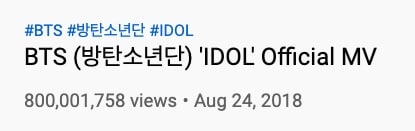 “IDOL” artık; DNA, Boy With Luv, FAKE LOVE ve MIC Drop (Steve Aoki Remix)‘ten sonra 800 milyon görüntülenmeye ulaşan 5. müzik videosu. Ve BTS, 800 milyon izlenmesi olan 5 müzik videosuna sahip ilk Asyalı sanatçı olurken; Coldplay‘den sonra 2. grup oldu.