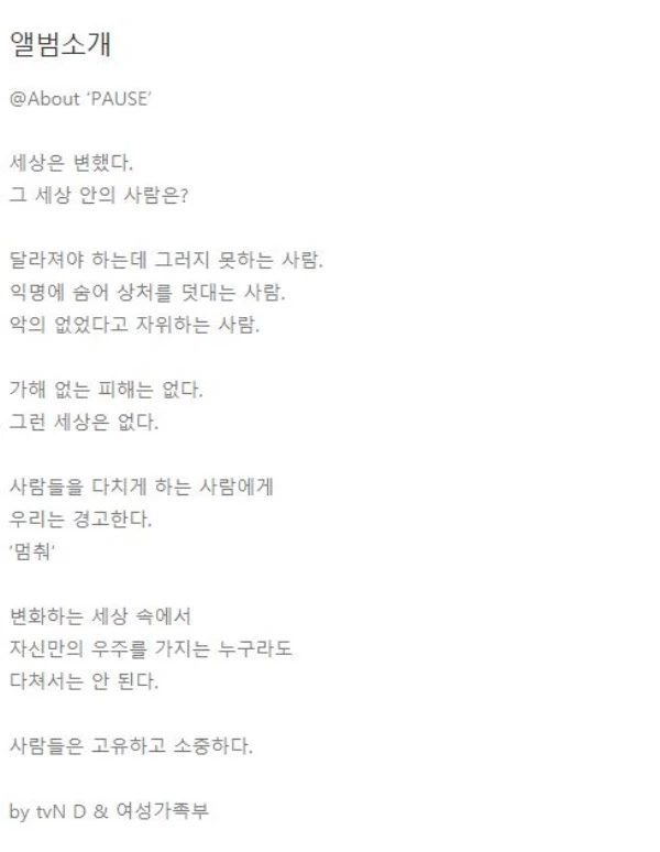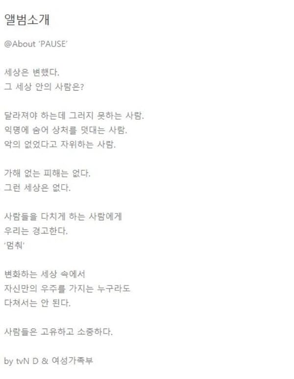 Ravi‘nin söylediği “PAUSE”, Toplumsal Cinsiyet Eşitliği ve Aile Bakanlığı’nın tvN D ile hazırladığı bir proje albümünden bir şarkı. Albümün tanıtımında “Dünya değişti. Ya o dünyadaki insanlar? Onlar da değişmeli ama yapamayanlar var. Başkalarını yaralamak için isimsiz bir ismin arkasına saklananlar var. Kötü niyetleri olmadığını söyleyerek kendilerini haklı çıkaranlar var. Ancak failsiz mağdur diye bir şey yoktur. Böyle bir dünya yok.” yazıyor.