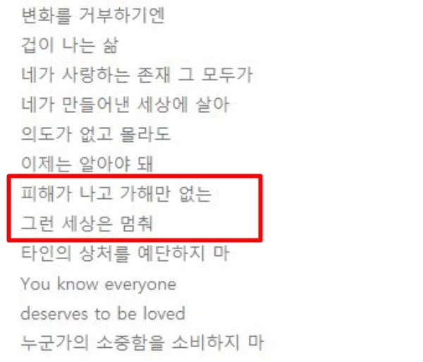 “Yazar Lee Ki Joo’nun “Temperature of Language kitabında ‘Herkes birinin her şeyidir’ ifadesini duyduğum anda, daha iyi bir insan olmaya çalışmam gerektiğini düşündüm. Bu proje için teklif aldığımda, şarkıda yazarın ifadesini kullanarak insanlara ulaşmak istediğimi düşündüm.” dedi ve katılım nedenlerini açıkladı.
