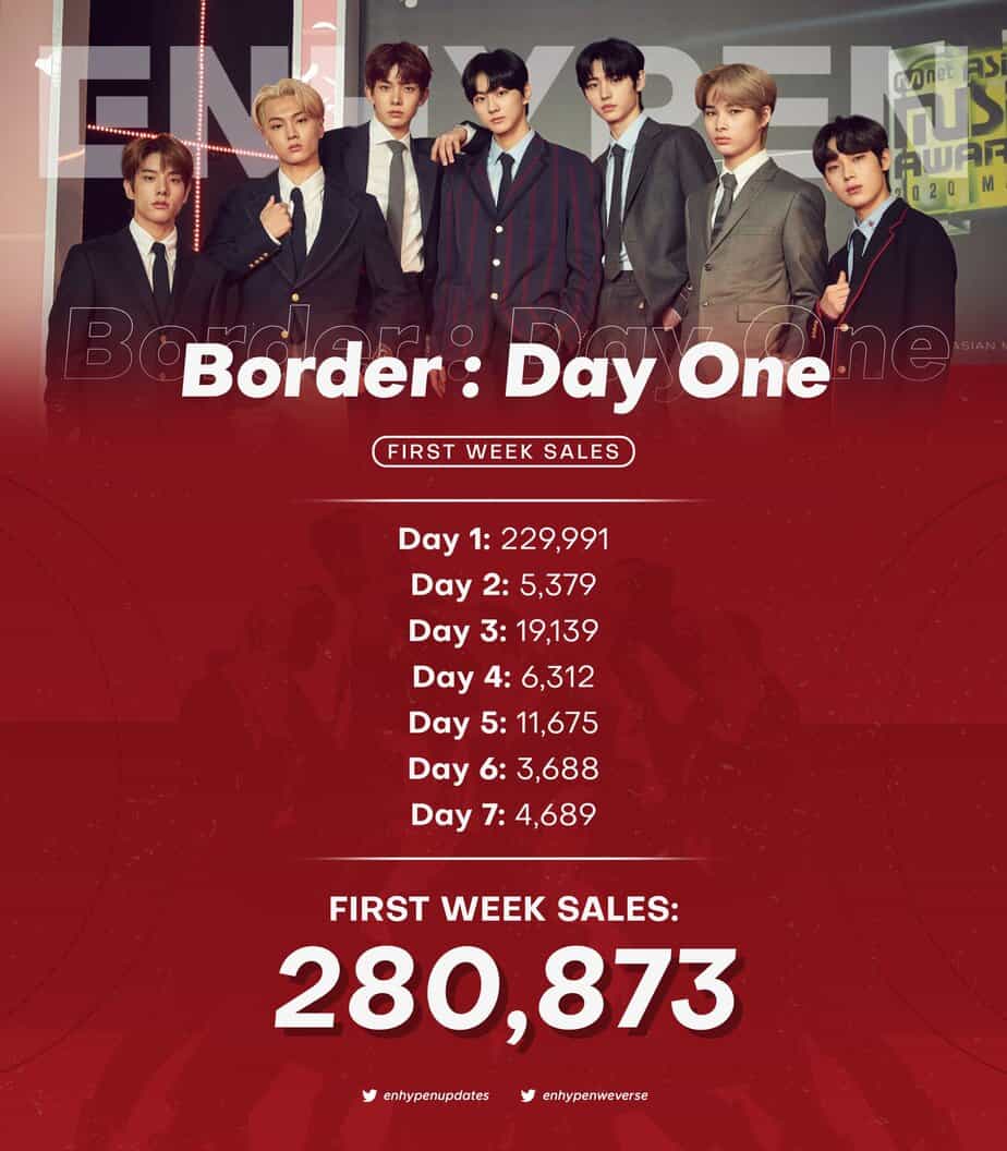 Hanteo Chart’ın 7 Aralık raporuna göre; grubun “BORDER: DAY ONE” albümü, 30 Kasım’dan 6 Aralık’a kadar bir hafta içinde 280.873 kopya sattı.