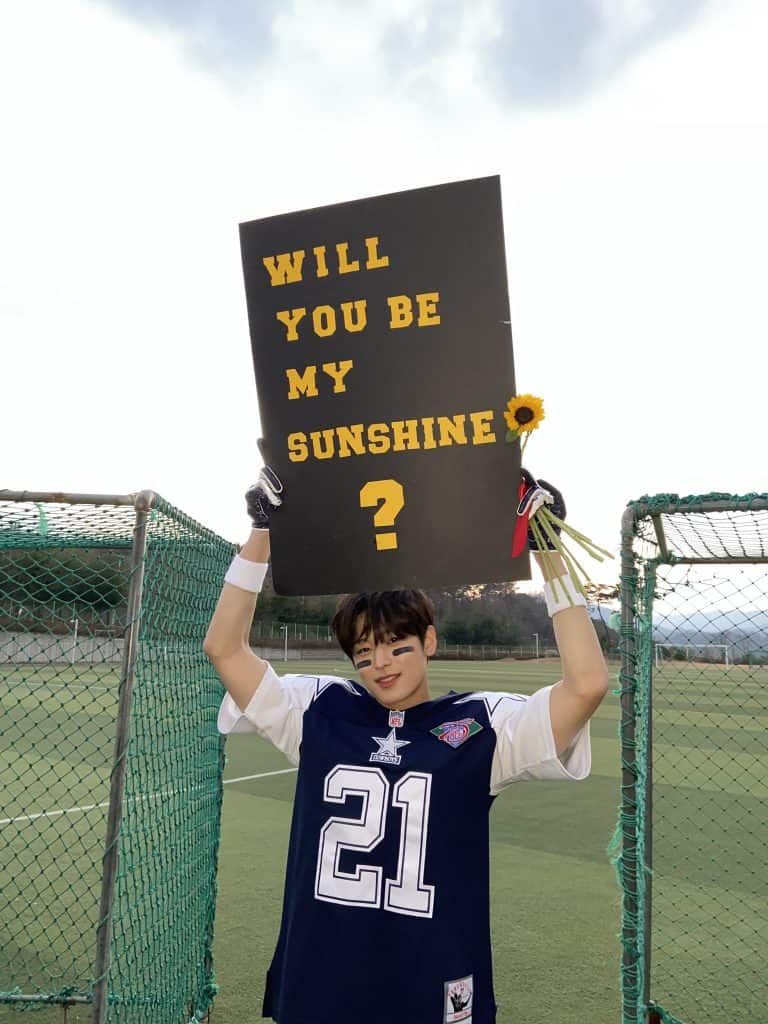 Lise temalı filmlerde kolayca görünen bir futbol formasına benzer bir forma giydiği görüldü. Ayrıca, dizlerinin üzerinde küçük bir buket ayçiçeği tutuyor ve ‘sana’ evlenme teklif ediyordu.