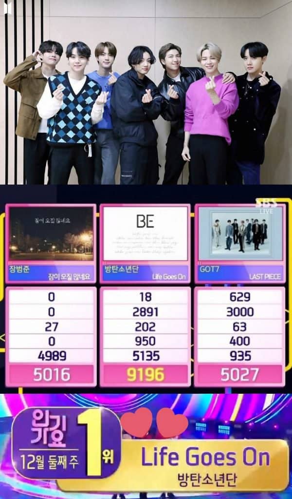 BTS‘in “Life Goes On“u, 9196 puan ile 6. galibiyetini kazandı ve 3 hafta üst üste bunu başararak “Triple Crown” elde etti.