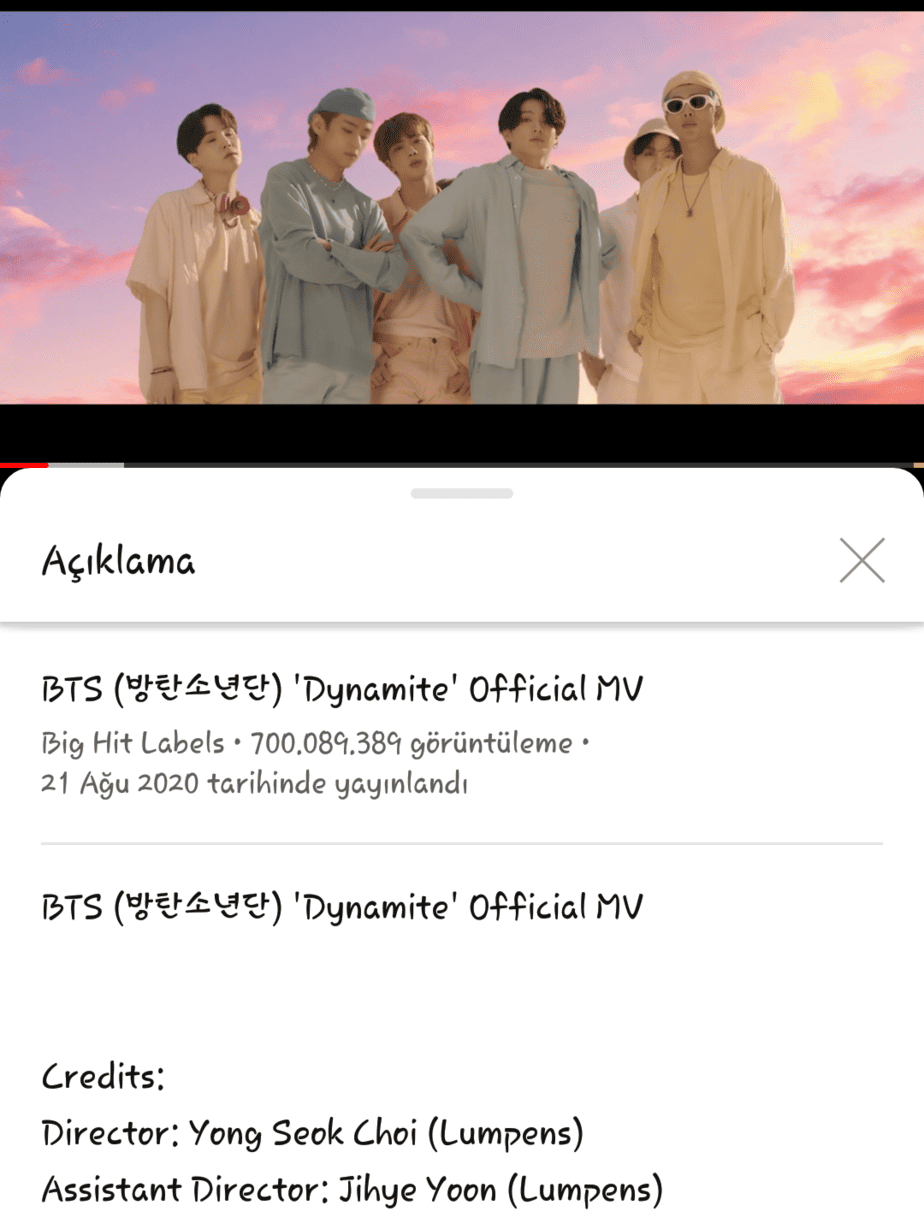 BTS’in, 21 Ağustos Cuma günü saat 07.00’de (Türkiye saatiyle) yayımlanan “Dynamite” müzik videosu, 17 Aralık 15:42 itibariyle 700 milyon görüntülemeye ulaştı.