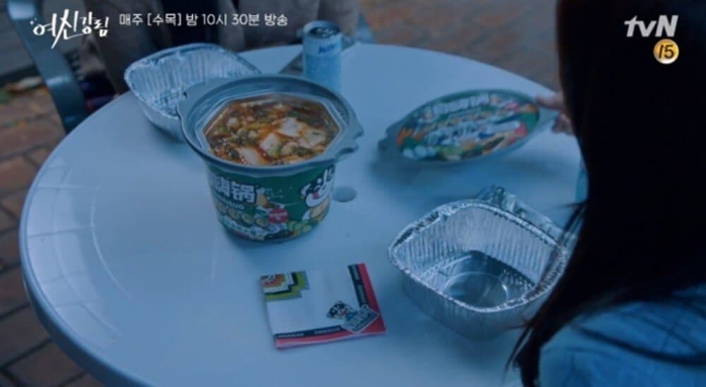 Ayrıca, iki karakter, Çin hazır eriştesini yemek için oturuyor. Drama, ürünün logosunu ve adını gösterdi.