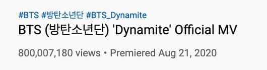 BTS’in “Dynamite” müzik videosu, 21 Ağustos 2020 tarihinde saat 07:00’te yayımlandı ve 24 Ocak 06:26’da (TSİ) 800 milyon görüntülenmeye ulaştı. Bu başarıya ulaşması, yaklaşık 5 ay ve 3 günden az sürdü.