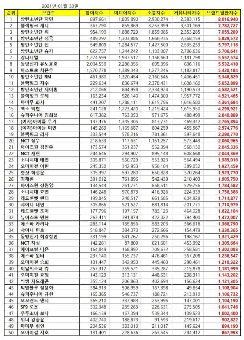 Sıralamalar, 30 Aralık 2020 – 30 Ocak 2021 tarihleri arasında toplanan büyük veriler kullanılarak, 1.453 idolün; tüketici katılımı, medya kapsamı, etkileşim ve toplum farkındalığı indekslerinin analizi ile belirlendi.