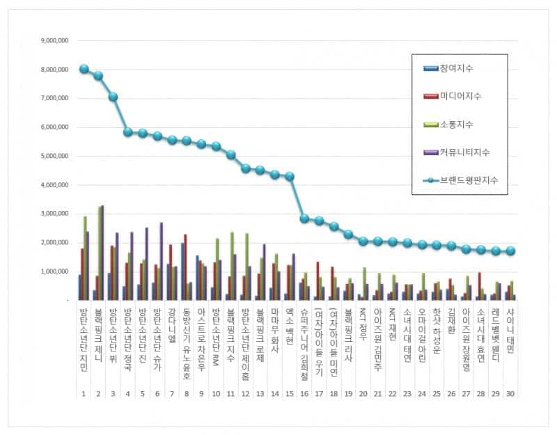 BTS’ten Jimin, 8.016.940 marka itibar indeksiyle bu ay listenin zirvesindeki yerini korudu. Jimin‘in anahtar kelime analizinde üst sıralarda yer alan ifadeler “ARMY“, “Sarang” ve “Doğum günü” olurken; en üst sıradaki ilgili terimler ise “Kutlamak“, “Seçilmiş” ve “Aşmak” idi. İdolün pozitiflik-negatiflik analizi %81.06 pozitif tepki aldı.