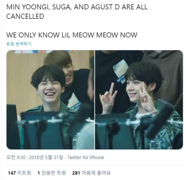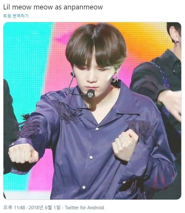 “Son zamanlarda I-Lovelies, Yoongi’ye ‘lil meow meow’ diye sesleniyormuş gibi görünüyor… Korecede bu ” 쟈근 애옹 애옹” gibi bir anlama geliyor. Yani sevimli, hatta 30009 katı kadar süper sevimli olduğu anlamına geliyor.”