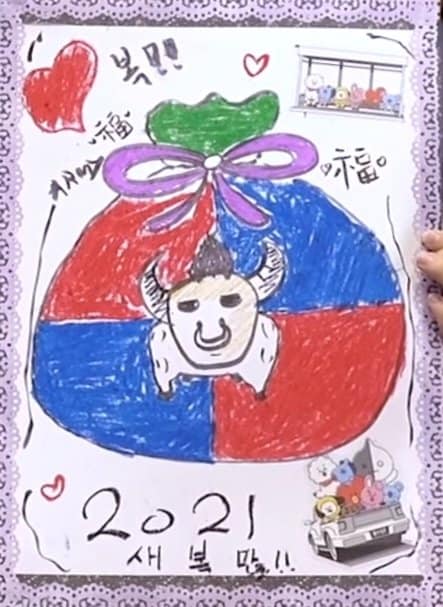 Ay takvimine göre “Beyaz Öküz Yılı”nın başlangıcı olan günlerde BTS, kendi elleriyle bir kutlama kartı hazırladığı bir video yayımladı. Videoda geleneksel Kore kıyafetleri hanbok’lar içinde gördüğümüz grup üyeleri, verilen süre içerisinde tamamlanması gereken görev paylaşımları yapmışlardı. V ve Jungkook, kartın ana temasını yansıtan beyaz öküz ve iyi talihi temsil eden ”bokjumeoni” (harçlık kesesi) çiziminden sorumluydu.