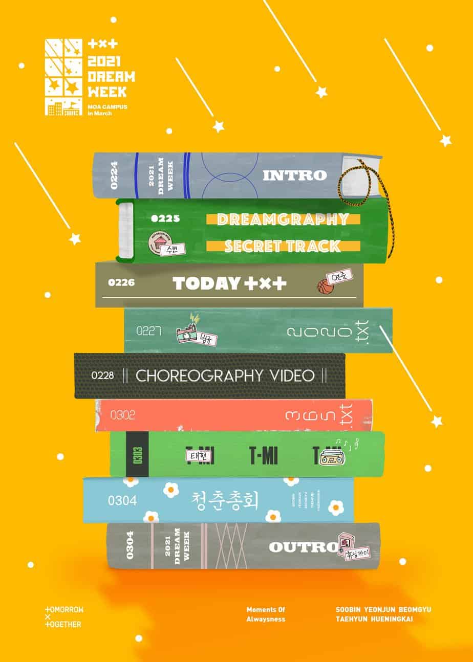TXT, çıkış yıl dönümünü “2021 DREAM WEEK” etkinliğiyle kutluyor! Mart ayı için planlanan “DREAM WEEK, MOA CAMPUS” etkinliği sırasında, bir hafta boyunca her gün TXT‘nin birbirinden farklı içerikleri yayımlanacak!