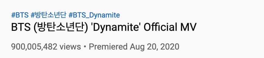 10 Mart saat 04:00’te (TSİ), “Dynamite“ın müzik videosu YouTube’da 900 milyon görüntülenmeyi aştı. Video, 21 Ağustos 2020 tarihinde saat 07:00’de (TSİ) yayımlandı. Bu kilometre taşına ulaşması yaklaşık olarak 6 ay, 16 gün ve 21 saat sürdü. (200 gün)