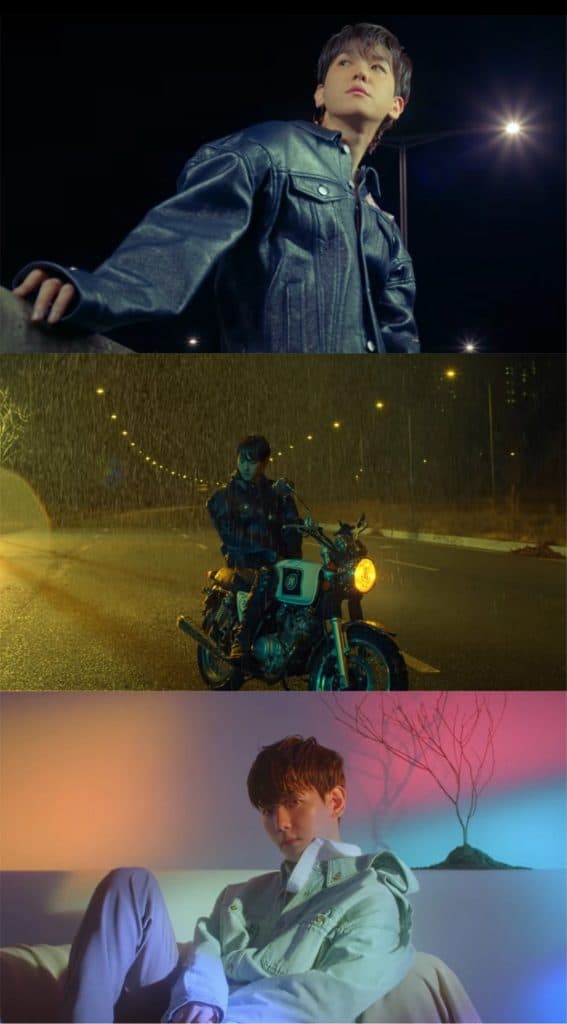 Mood Sampler’da Baekhyun, farklı sahnelerde dururken elektro gitar fon müziğiyle karamsar bir karizma sergiliyor.