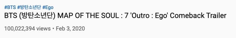BTS’in, “MAP OF THE SOUL : 7” geri dönüş tanıtım videosu 21 Mart 02:24’te (TSİ) YouTube’da 100 milyon görüntülenmeye ulaştı. Video, J-Hope‘un solo şarkısı “Outro : Ego” ve şarkının adından da anlaşılacağı gibi BTS’in 2020 albümü “MAP OF THE SOUL : 7” için çıkış işlevi görüyor.