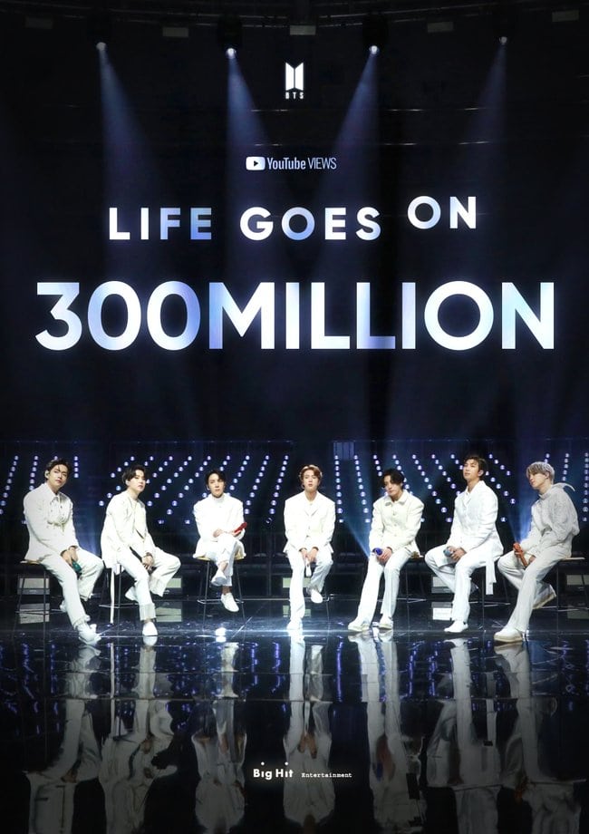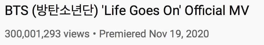 27 Mart günü, saat 08:18’de (TSİ) BTS‘in “Life Goes On” müzik videosu, YouTube’da 300 milyon görüntülenmeyi aştı ve DNA, Fire, Dope, Blood Sweat & Tears, MIC Drop (Steve Aoki Remix), Fake Love, Save Me, IDOL, Not Today, Boy With Luv , Boy In Luv, Spring Day, Dynamite ve ON (Kinetik Manifesto Film: Come Prima)‘dan sonra bunu başaran 15. müzik videosu oldu.