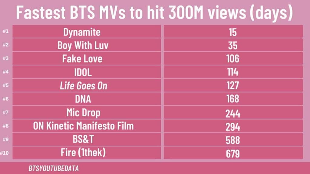 YouTube’da 300 milyon görüntülenmeye ulaşan en hızlı BTS müzik videoları: