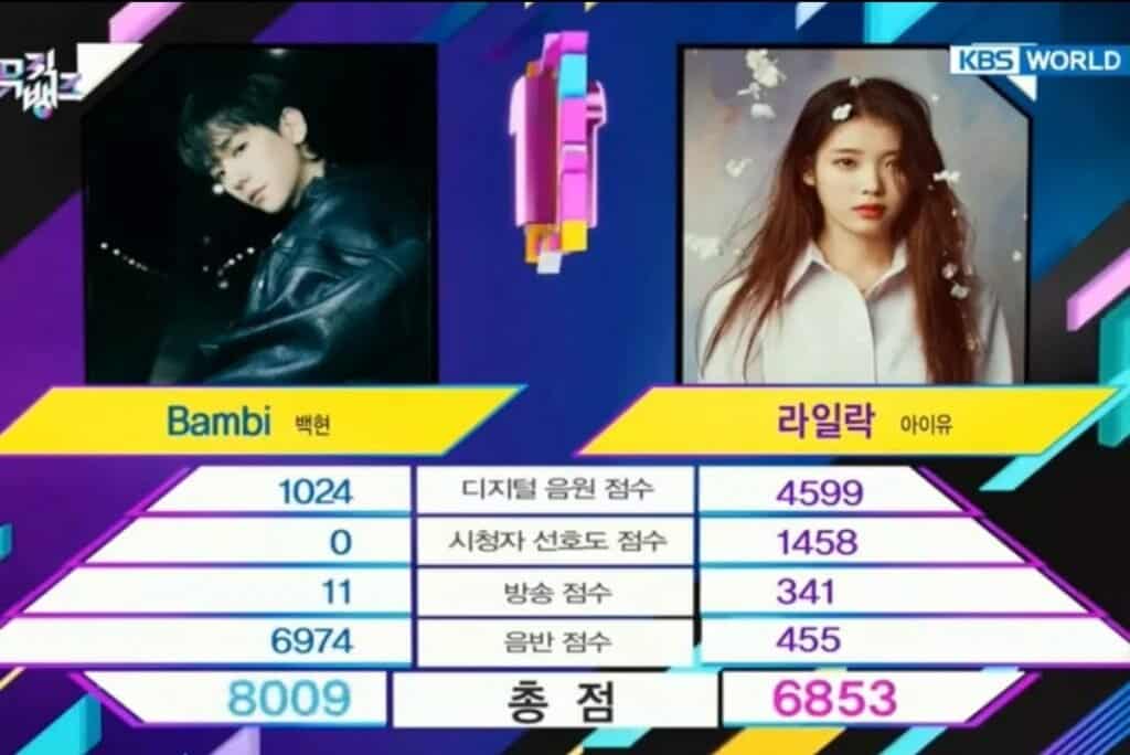 “Music Bank”in 9 Nisan’daki bölümünde, EXO‘dan Baekhyun “Bambi” ve IU “LILAC” birincilik adayları olarak gösterildi. Baekhyun, “Bambi” ile ilk galibiyetini “LILAC”ın 6.853 puanına karşılık 8.009 puanla aldı.