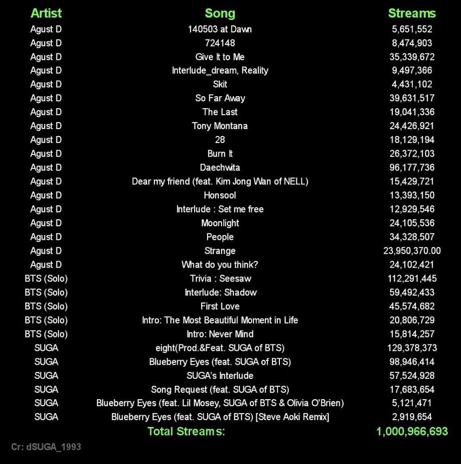 BTS‘ten SUGA; Spotify’da, mixtape’leri Agust D, D-2 ve BTS albümlerinde yer alan solo şarkılarının toplamıyla 1 milyar dinlenme sayısına ulaştı.