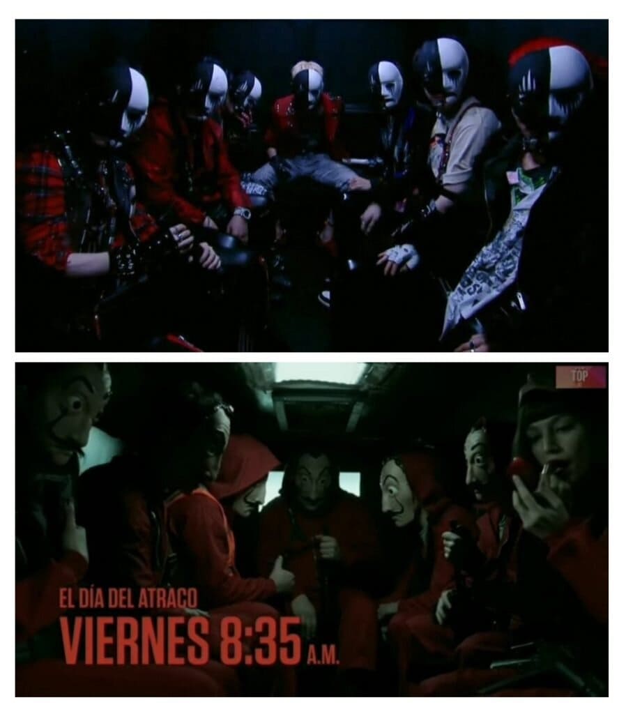 Minibüs durduğunda, ATEEZ’in maskeler taktığını görüyoruz; Tiyatrodaki duyguları simgeleyen maskeler. Performansın bu bölümünü Para Soygunu dizisine bağlarsak, ATEEZ “sanat” gibi görünen bir şeyi yayınlamak istiyor gibi görünüyor!