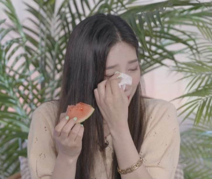 Ardından bir hayran, sakinleşmesi için ona biraz karpuz yemesini söyleyen bir sohbet mesajı gönderdi. Joy birkaç parça alıp yemeye başladı ama gözyaşlarını tutamadı! Ağlayarak oldukça komik bir şekilde: “Artık karpuz yediğim için çok daha iyi hissediyorum T_T “ dedi.