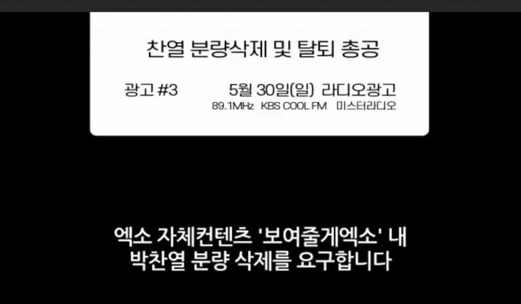 30 Mayıs’ta, netizenler 89.1MHz KBS COOL FM’de çalan bir radyo reklamıyla Chanyeol’un geri çekilmesi için bir dilekçe mesajı belirlediler. Daha öncesinde de bazı kişiler, son zamanlarda SM Entertainment’ın önüne balonlar koyarak Chanyeol’un ayrılması için dilekçe vermişlerdi.