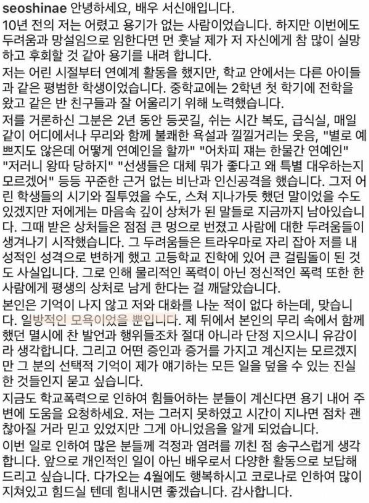 Bir hafta sonra, yani 26 Mart’ta, Seo Shin Ae Instagram hesabında bir açıklama paylaştı.