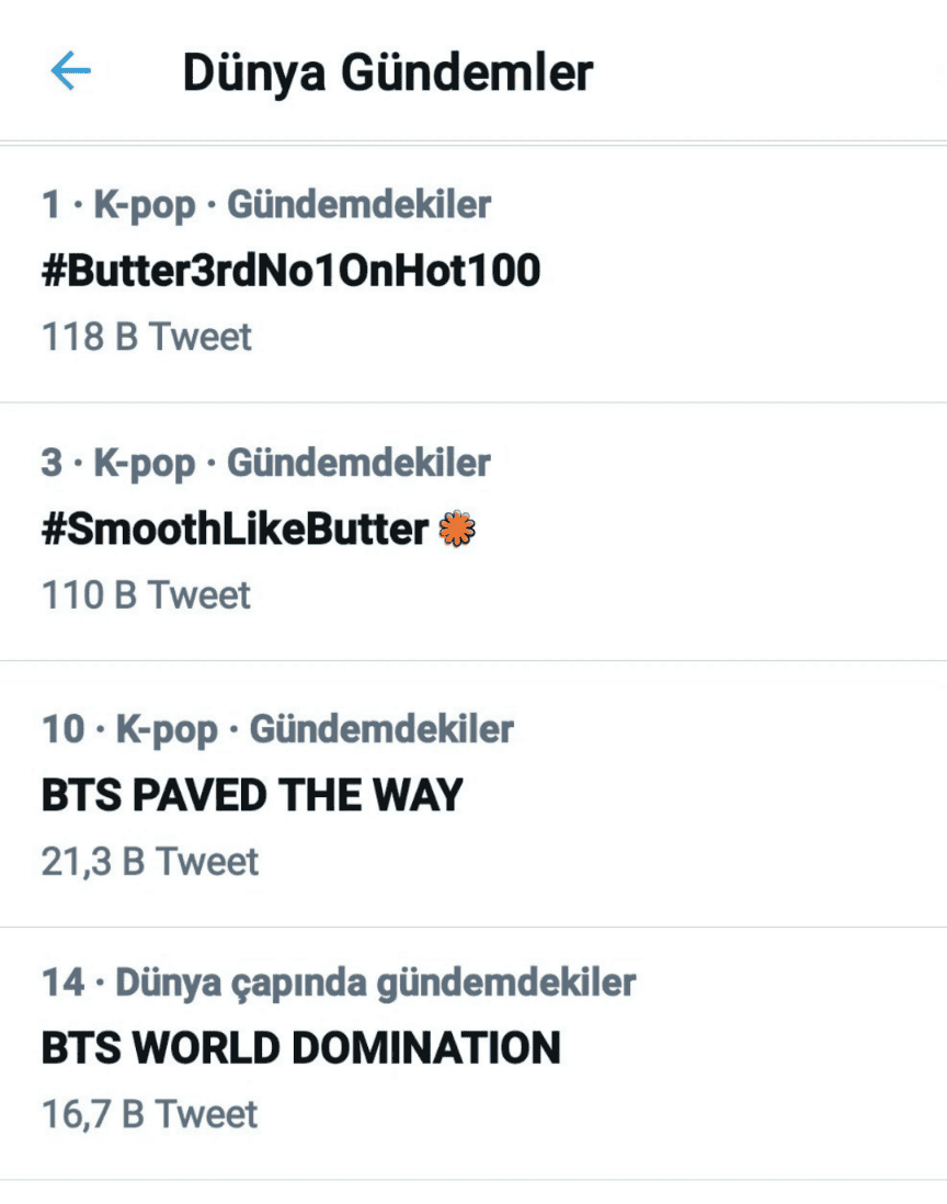 “Butter“, bu haftanın Billboard Global 200 Excl. US (Amerika Hariç) listesinde konumunu koruyarak 3. haftasında da 1 numarada kalmaya devam etti!
