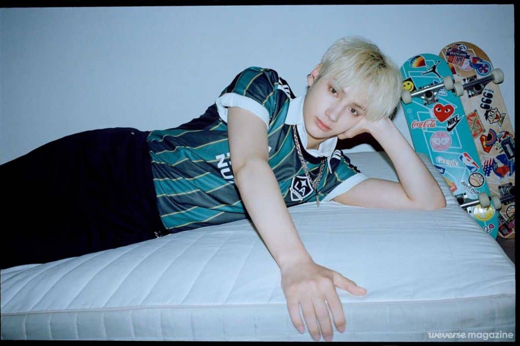 Hueningkai: Kendi kıyafetlerimizi giydik ve MOA oy kullandı ve tahmin edin ne oldu? Kazandım! (gülüyor) Dışarı çıkmak için giyinmek zorunda kalsaydım muhtemelen böyle giyinirdim diyerek giyinmeye çalıştım. Ayakkabıları ödünç aldığımı öğrendiler ama yine de kendi ayakkabılarımın işe yarayacağını düşünmüştüm. Ayakkabılarımı giydim ve Yeonjun’a “Bu nasıl?” diye sordum. “Fena değil ama converse daha iyi olurdu” dedi. Bu yüzden stilistimizden o gün için bana bir çift ödünç vermesini istedim. Her zaman kapüşonlu ve eşofman en iyisi!