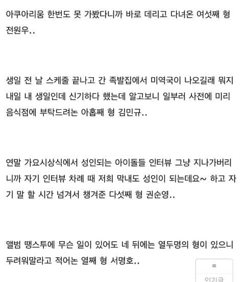 Onuncu hyung, Seo Myungho, albümünde ‘Teşekkür’ kısmında şunları yazdı, ‘Ne olursa olsun korkma, arkanda her zaman 12 hyungun var’…]