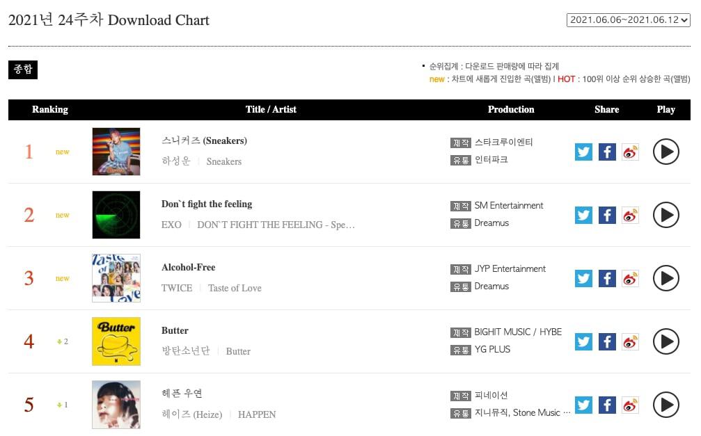 EXO‘nun “DON’T FIGHT THE FEELING” albümü, Albüm listesine zirveden giriş yaparken; Ha Sung Woon‘un “Sneakers“ı da, İndirme listesine zirveden giriş yaptı.