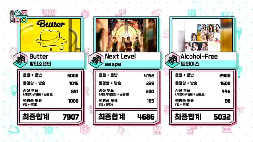 BTS, 7.907 puanla galibiyeti evine götürdü ve bu “Butter”ın 12. birinciliği oldu! Böylece, 2021 yılının en çok müzik şovu ödülü kazanan şarkısı oldu! Ayrıca BTS, toplam 143 ödül ile en fazla müzik şovu birinciliğine sahip sanatçı olma rekorunu genişletti.