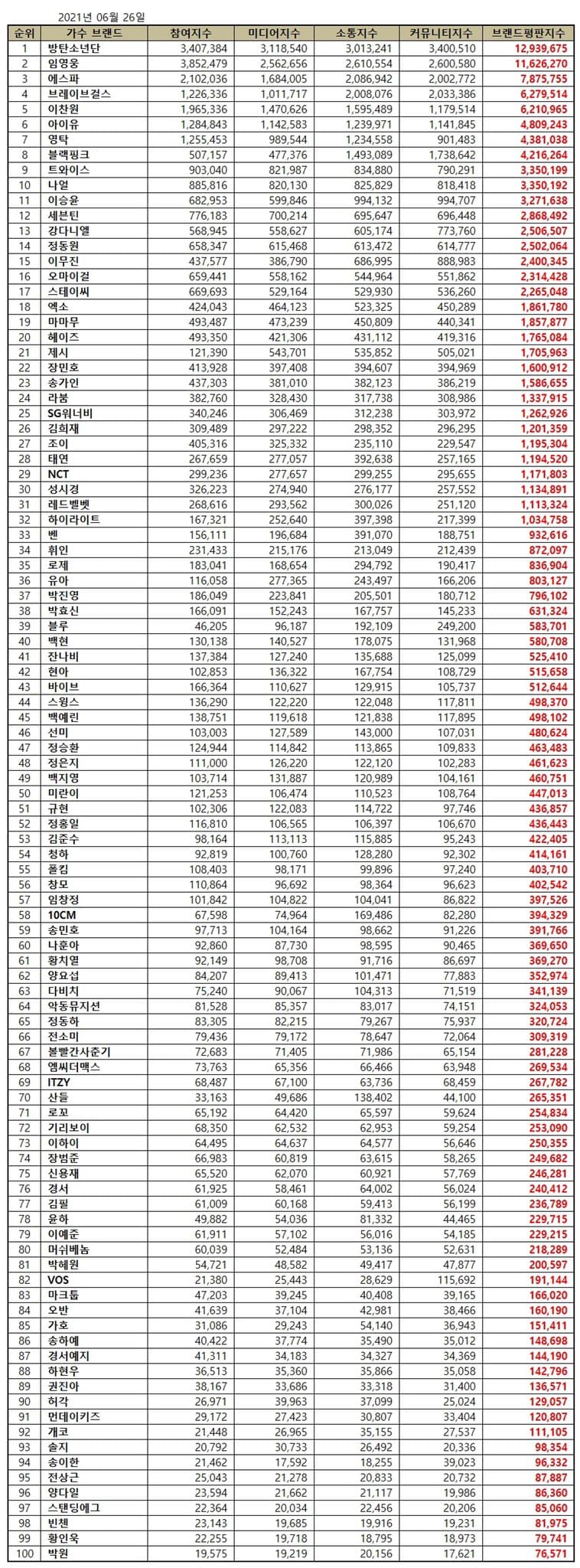 Sıralamalar, 26 Mayıs – 26 Haziran arasında toplanan büyük veriler kullanılarak, şarkıcıların; medya kapsamı, tüketici katılımı, etkileşim ve toplum farkındalığı indekslerinin analiziyle belirlendi.